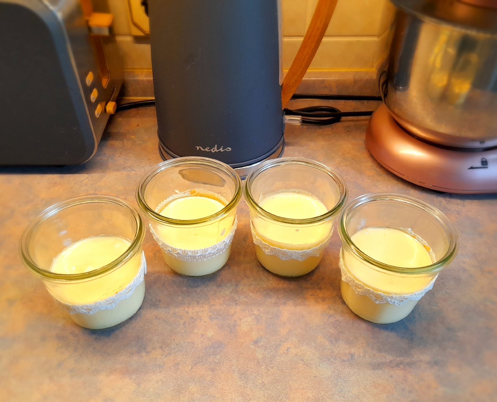 2 Eier trennen, die Eigelb mit 70 g Zucker, Xucker oder anderer Süße und 2 Eßl.Wasser ein paar Minuten schaumig rühren.